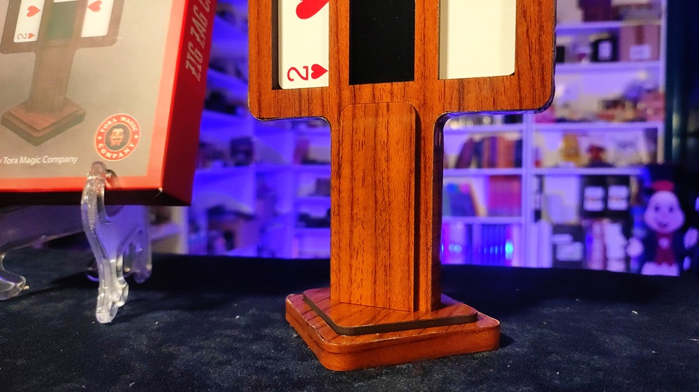 Un espectador elige una carta, la cual se muestra claramente al público y se coloca en un pequeño marco de madera, cuidadosamente construido y montado sobre un pedestal que aporta estabilidad y presencia escénica.