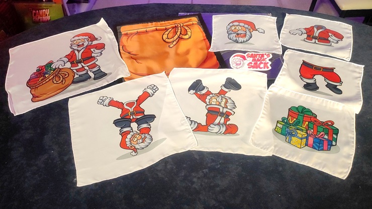 Los niños gritan emocionados: «¡Regalos!» El mago, dándose cuenta de su error, saca un pañuelo con regalos y se lo da al niño para que lo meta en el saco junto con los demás. Tras decir las palabras mágicas una vez más, ocurre algo increíble: del saco sale un pañuelo precioso que muestra a Papá Noel completo, feliz y con su saco lleno de regalos. ¡Magia navideña en su máxima expresión!