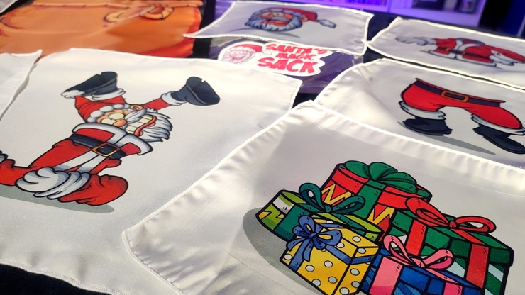 El niño introduce la mano en el saco y saca tres pañuelos con dibujos impresos en vivos colores: