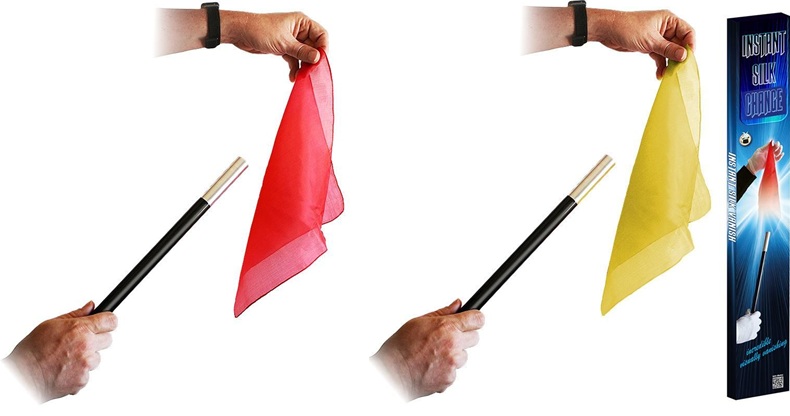 POR EJEMPLO: El mago muestra un pañuelo de seda rojo… un simple toque con la varita mágica, ¡y ante la mirada atónita del público, se transforma visualmente en un pañuelo amarillo!